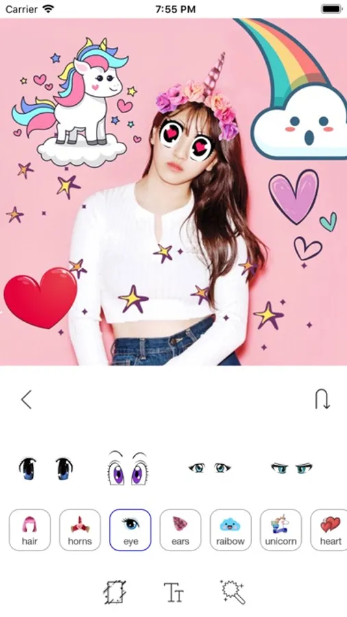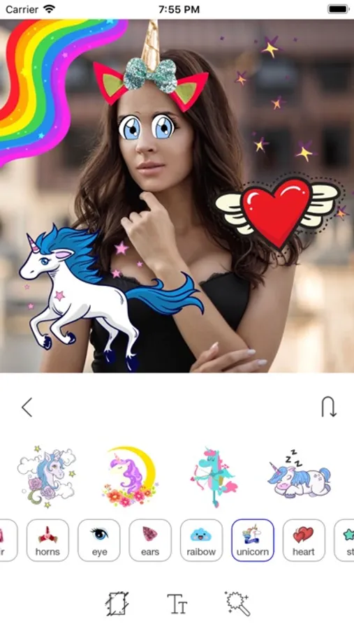 In our app Unicorn Photo Editor we selected the best and the most beautiful stickers: unicorn stickers, rainbow stickers, eyes stickers, hair band stickers, colored hair sticker, unicorn horn stickers, funny ears stickers, star stickers and cloud stickers, heart stickers!