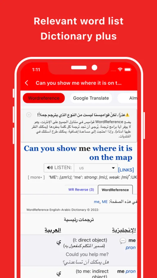 مترجم وقاموس من الإنجليزية إلى العربية ومن العربية إلى الإنجليزية عبر الإنترنت وغير متصل بالإنترنت مع القدرة على العثور على جمل وتعبيرات مماثلة.