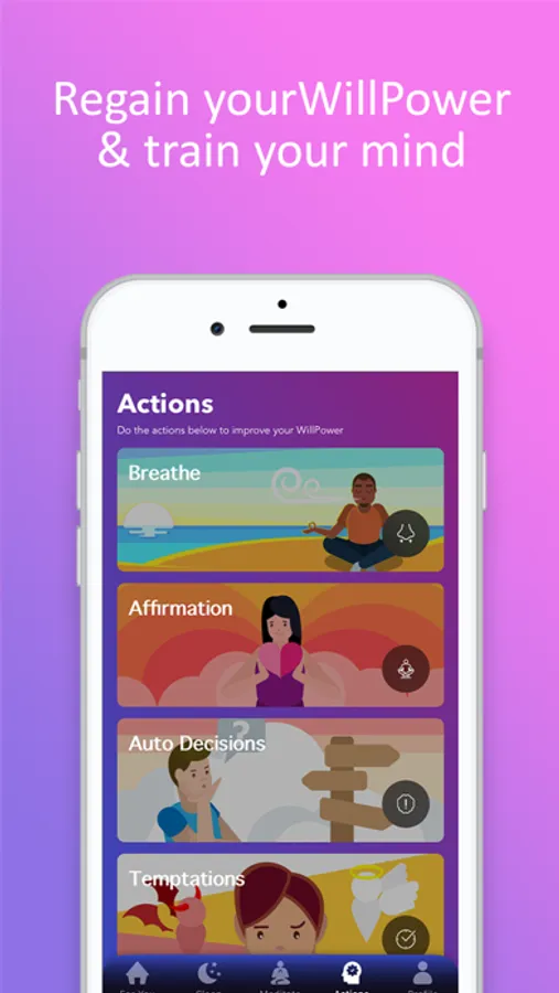 It takes only a few minutes per day to set you on the right track of improving your WillPower by training your mind through specific tasks such as meditation, breathing, affirmations, sleep, habit tracking, exercising, visualization, goals ,etc.
