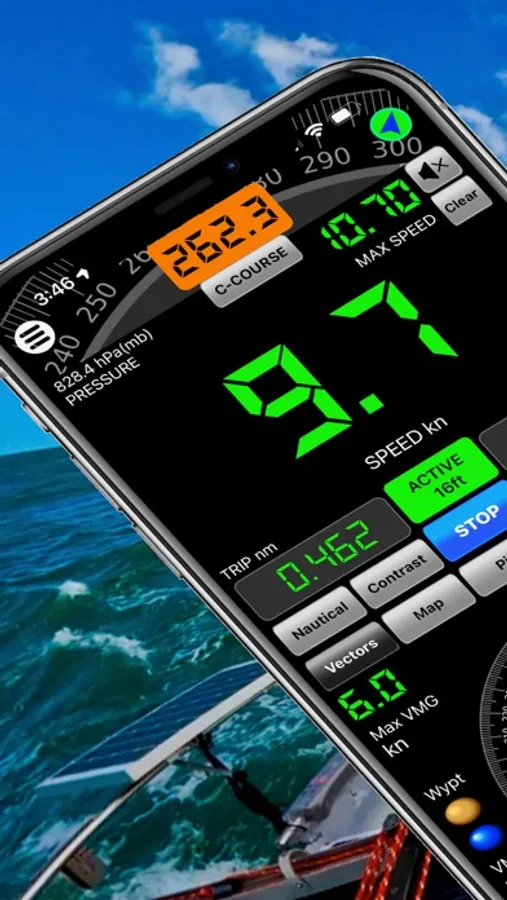 - VMG visual assistant: guides you to the best course to the waypoint on the current tack