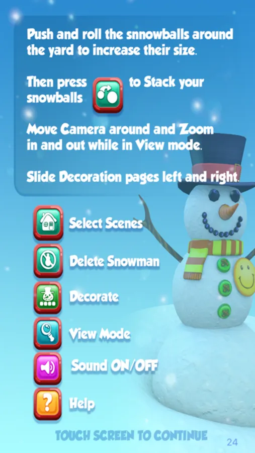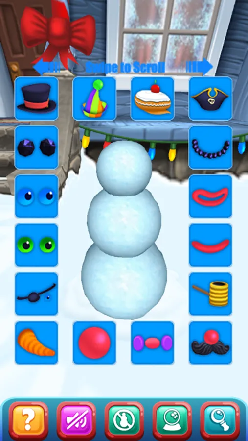 Snowman 3D is a visually pleasing diversion, which allows you to build and decorate your own unique snowman. You can roll a snowball around the backyard, until you reach the size you like. Once three snowballs have been completed and stacked, you can decorate your snowman. There are dozens of different 3D items, which you can attach to your snowman. When you are satisfied with your creation, you can take a snapshot of your work, save it in your photo album, then send it to your friends. Use swipe to move the snowball; pinch and swipe to control the camera, taps and swipes to navigate through pages of decorations.