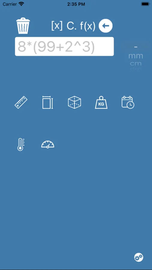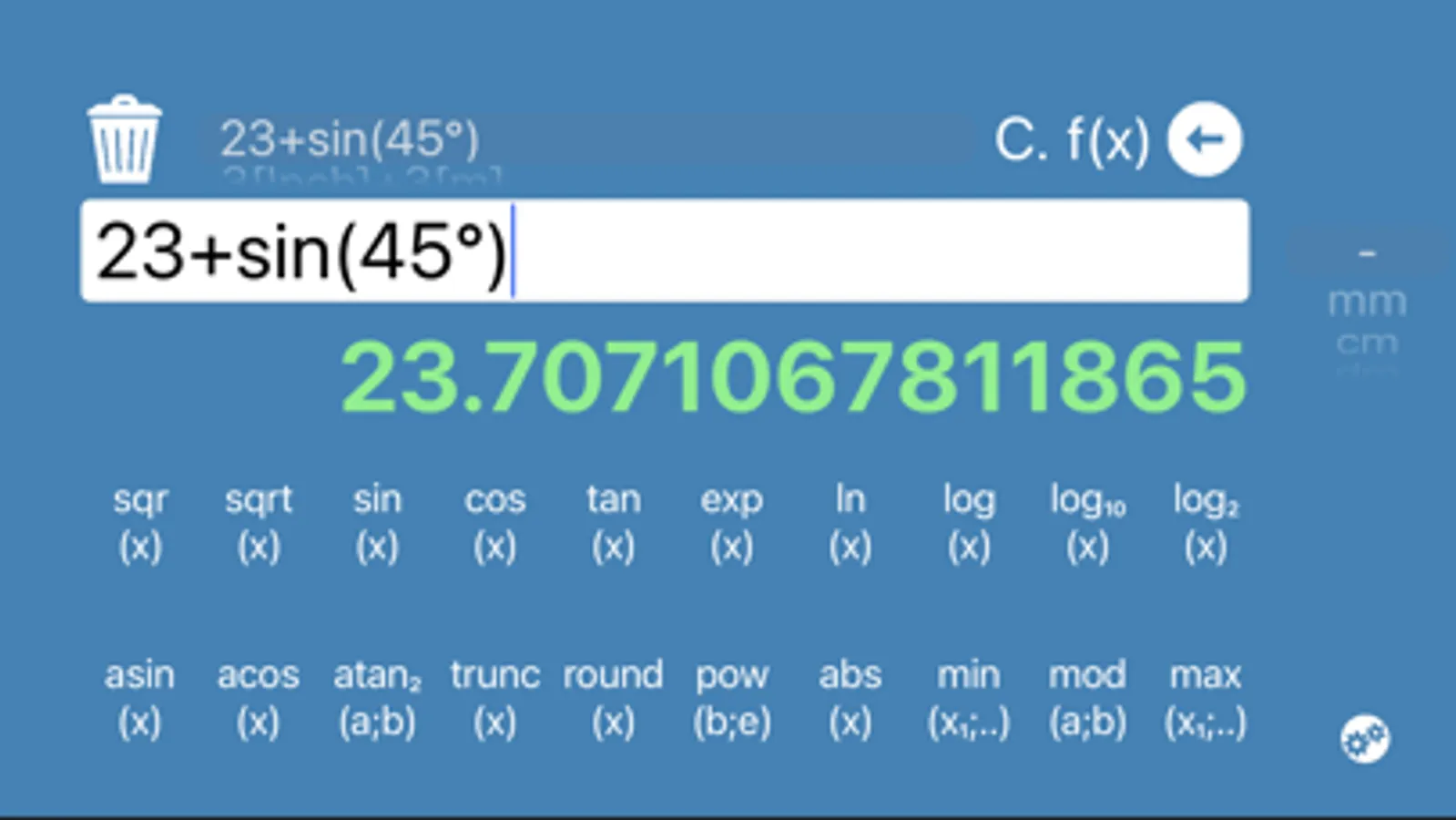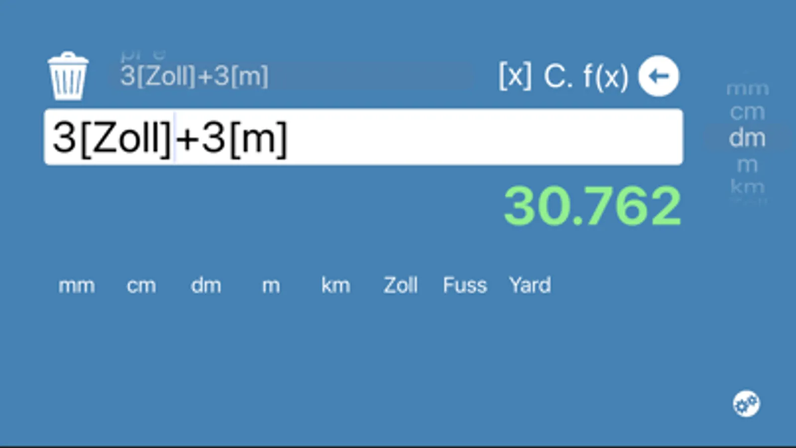 In the free version, the last 5 previous calculations can be restored using a selection box or by swiping vertically on the input field. An in-app purchase can increase the number of previous calculations to 500. With another in-app purchase, the history (optionally including the results) can be displayed in a separate table in which earlier terms can be searched for in order to use them for further calculations.