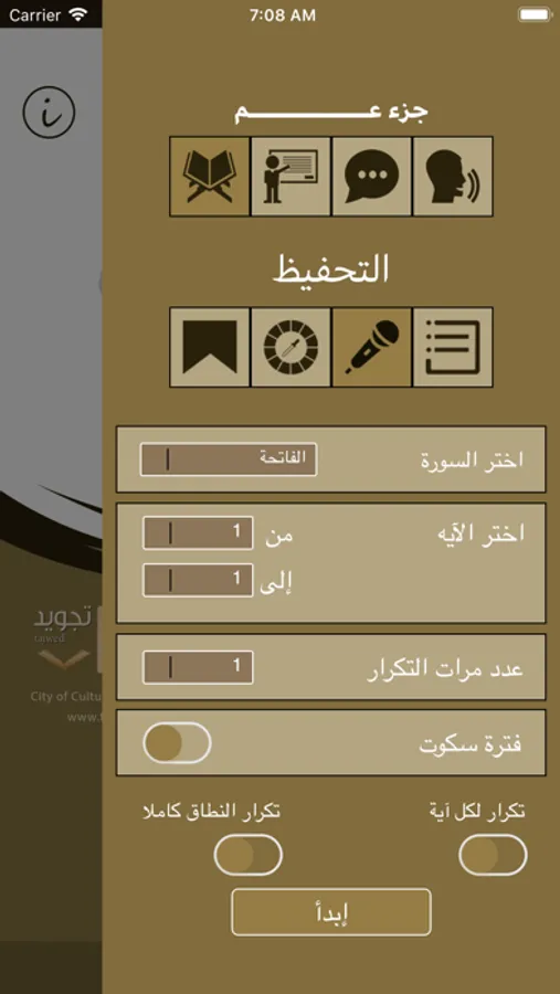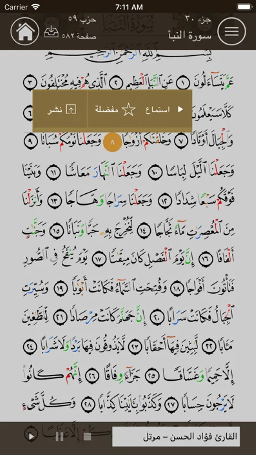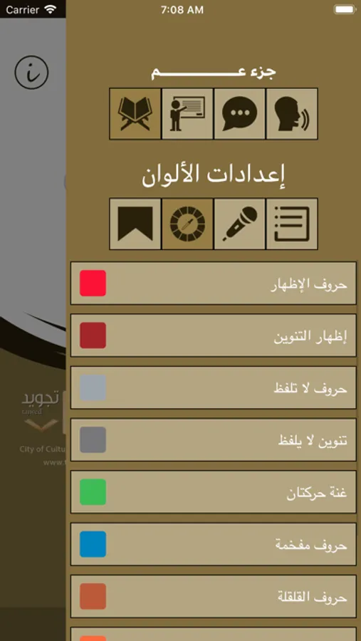 يحتوي التطبيق على عرض جزء عم ملوناً، تطبيقاً على طريقة تلاوة القرآن الكريم بأحكام تجويد القرآن الكريم من خلال استخدام الألوان بصوت القارئ الشيخ فؤاد الحسن