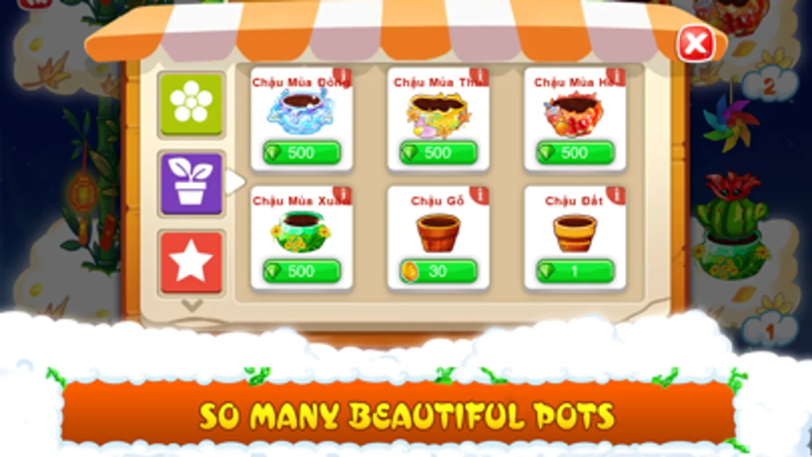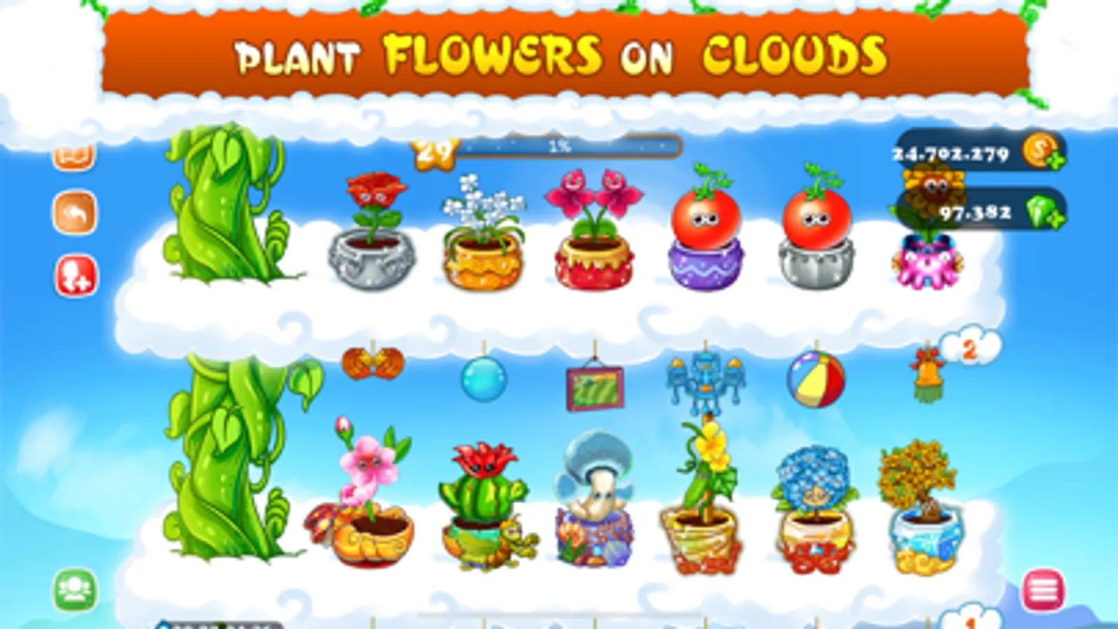 Lost in the wonderland, where you'll be tasked with planting on beautiful white clouds. Many seeds give strange flowers and also help you make a lot of money when harvesting.The earned money will help player buy more precious seeds, or buy decorative items to make your garden more sparkling. Besides, don’t forget to upgrade your pots. It will be useful for you. In addition to make your garden more beautiful, the upgrade also improves the harvest and reduces the growing time. The plants will grow faster and to be harvested faster too.