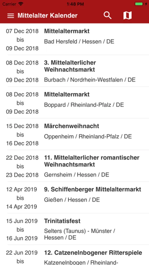 Die App zeigt Veranstaltungen mit mittelalterlichen Character an. Die Daten basieren auf den Inhalten von www.mittelalterkalender.info .