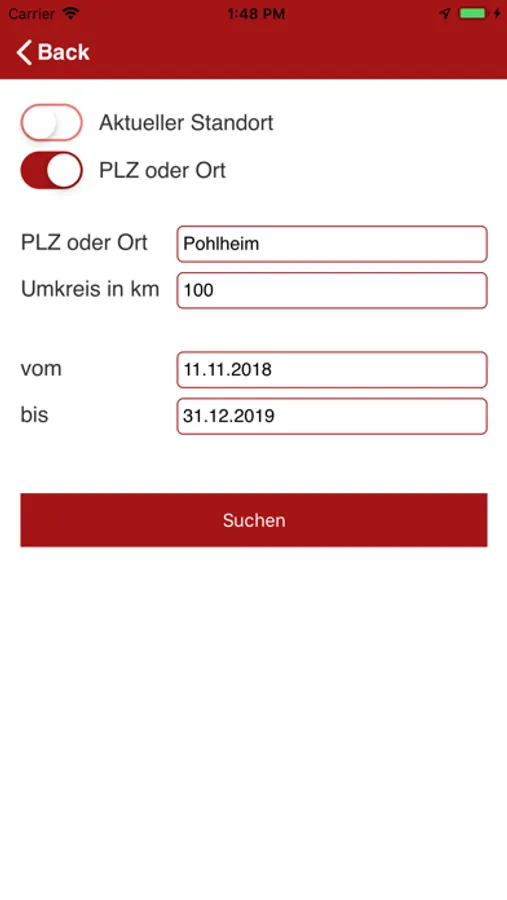 Eine Umkreissuche ist integriert, ebenfalls können die Veranstaltungsorte auf einer Karte angezeigt werden.