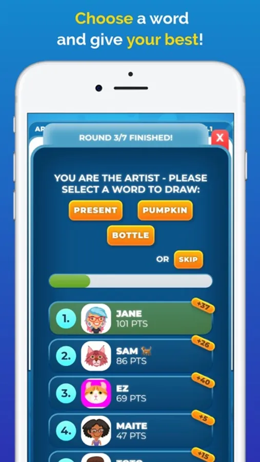 In multiplayer mode, one player is selected as the artist, he is offered three words to choose from and his task is to draw the selected word. The other players try to guess what the artist is drawing. The winner is the player who first guesses the correct word.