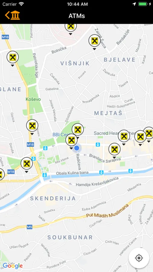 Aplikacija prikazuje vaš položaj u odnosu na bankomata odabrane banke, tapom na lokaciju