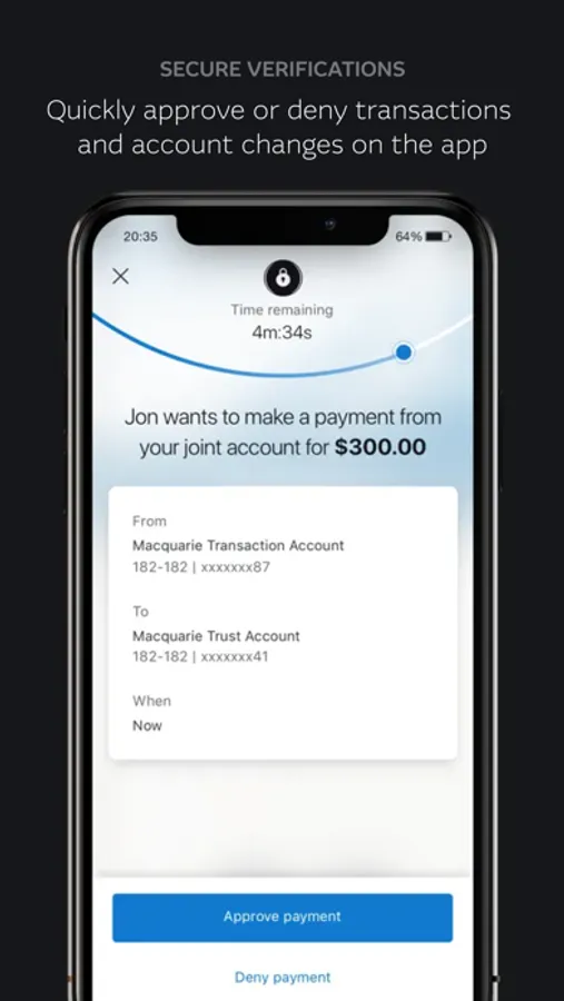 It's a mobile app that sends actionable push notifications for you to approve or deny online transactions and account changes or generate a unique one-time rolling code as an alternative authentication method. You’ll find it’s faster and easier than SMS, and it works more seamlessly when you’re travelling overseas as it’s connected to your device, not your phone number. If you happen to be travelling and you're not connected to a cellular or Wi-Fi network, the Macquarie Authenticator app will give you the option to use a rolling code to verify your transaction.