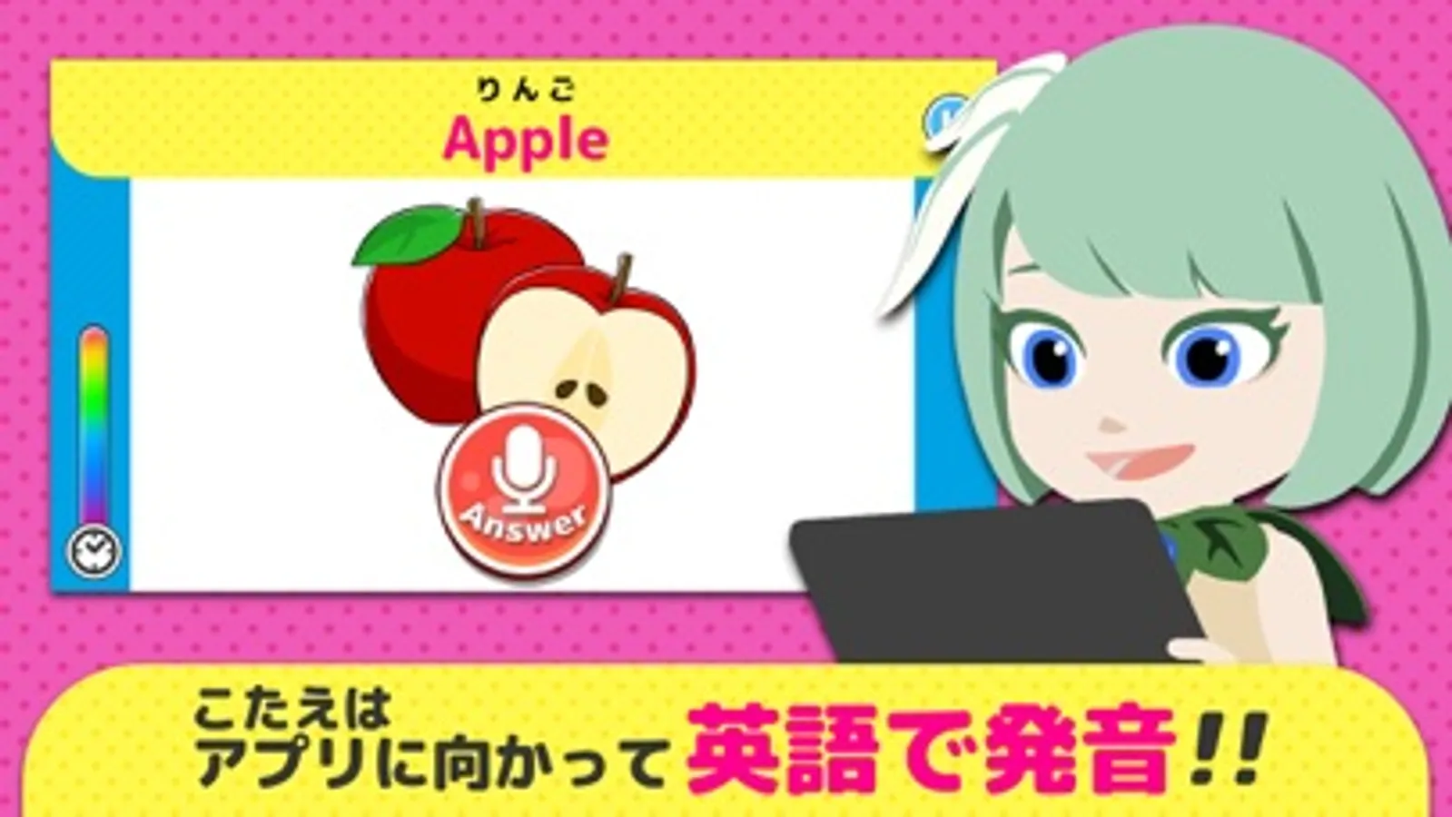 ネイティブの発音で3つの英語ヒントを"聞いて"、答えを"考えて"、英語で"発音する"、という英語の動作を、遊びの中で楽しくできるよう制作しました。