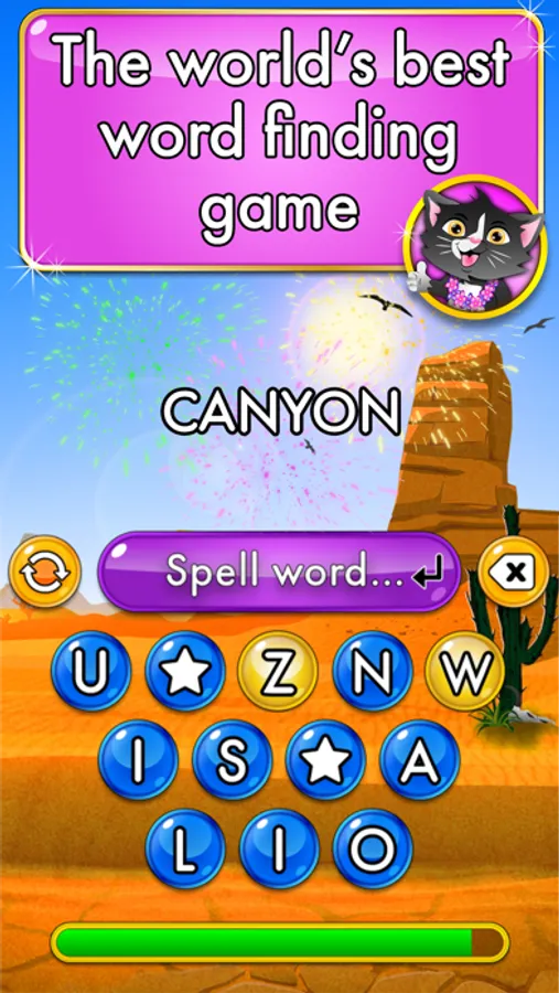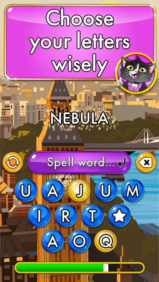 Create the longest word possible with the letters provided. Bigger words mean more points and show more skill. Unlock gold letters to add oomph to your score. Use the star to replace any single letter, and see if you can make your words even better and longer!