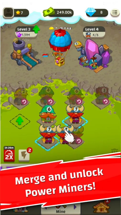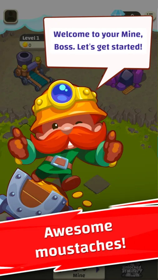 * Merge miners to unlock more powerful ones! (with super mustaches and awesome hats they all look different. Collect them all)