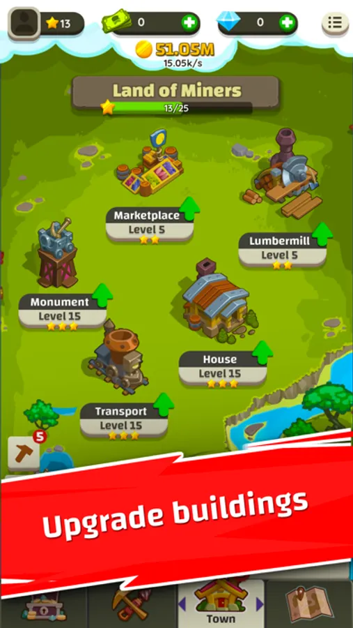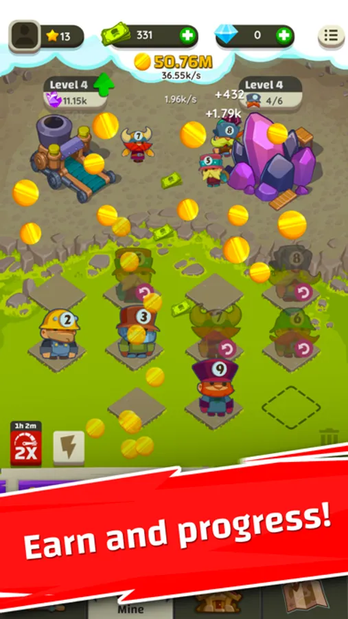 Combine bonuses wisely to create a powerful boost to your mining Town. Manage your business effectively and earn offline!