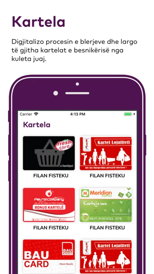 “Kartela” është aplikacioni i cili ofron digjitalizimin e të gjitha kartelave të besnikërisë. Lehtëson procesin e blerjeve, duke mbledhur pikët vetëm përmes skanimit të barkodit nga telefoni, pas cdo blerje. Zbraz kuletën nga kartelat e tepërta, dhe zëvendëso ato duke i ruajtur në një aplikacion të vetëm...