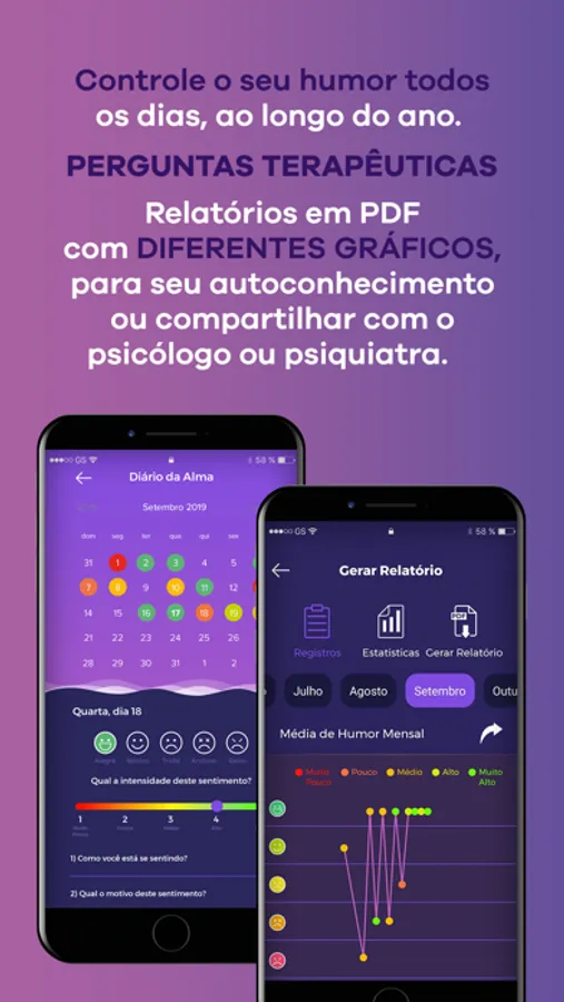 - Diário das emoções com ferramenta científica exclusiva, para mapeamento dos estados de humor, todos os dias do mês