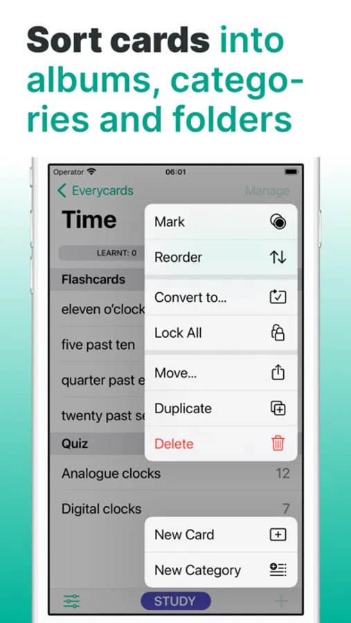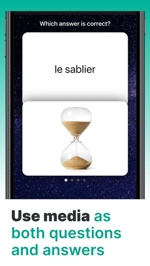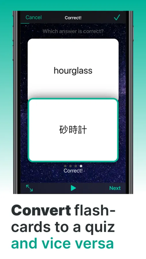 CONVERT flashcards to a quiz and vice versa with a couple button presses.* Everycards has only two learning modes: flashcards and quiz, they are highly effective: