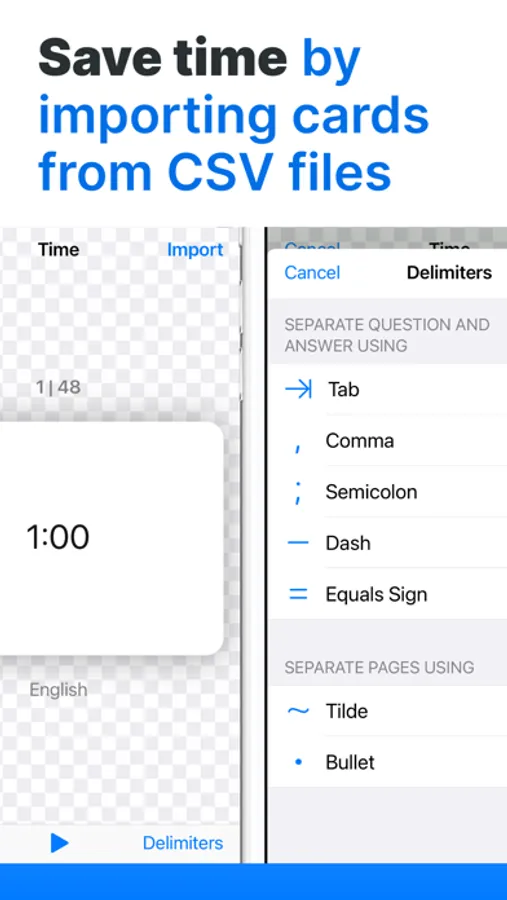 Save time by IMPORTING cards from CSV files.* In Everycards, you can immediately see what you will get as a result of the import.