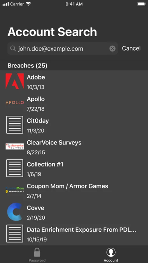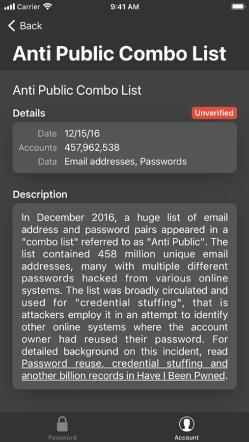 Pwned uses the Have I Been Pwned? database created by security researcher Troy Hunt. When sites are hacked, any public information about the accounts and passwords included in that breach are added to this database. It can include user names, email addresses, passwords, and more.