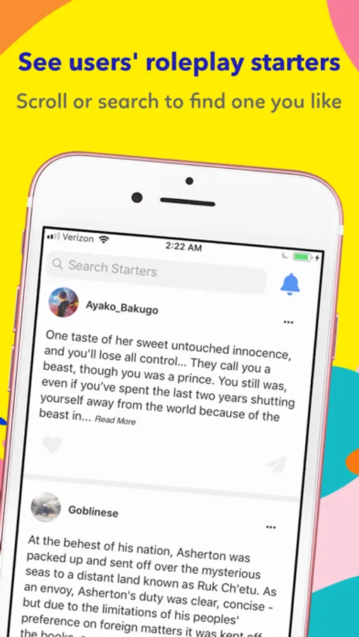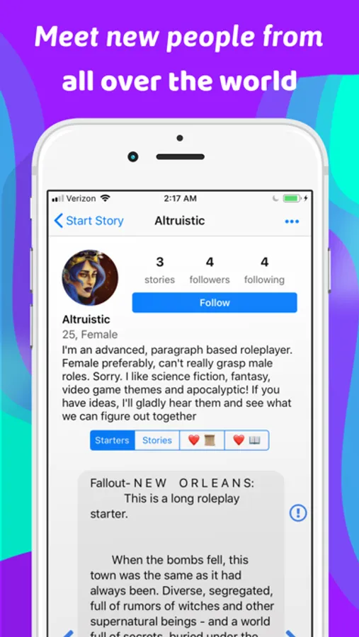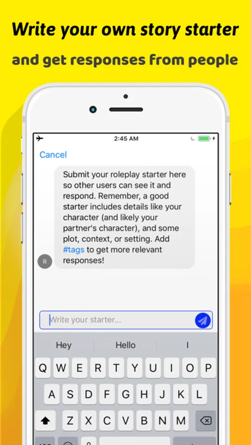 Read chat text stories and create your own with people. View other’s roleplay story starters—If you see one you like, reply to begin writing your story together! You can write your own role play starter and get responses from other role players. Take inspiration from your favorite characters and plots in books, movies, TV, history, anime, life, or imagine something completely new! You can write stories with the people you meet with text or voice audio messages! Collaboratively create and author novel stories you’ll love together with your new pen pals, and make your first rook— roleplay book. The world is waiting for the advanced artistic literature you create! Or for you to come and just have fun :)