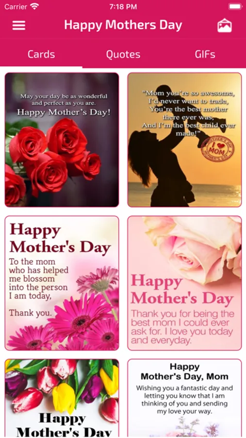 This app has exclusive collections of Cards, GIFs, Wishes, Greetings and Photo Frames for Mother's Day. Mother's Day Wishes & Cards app are the best way to send wishes & greetings to your mother. You can easily download or share greetings from the app.