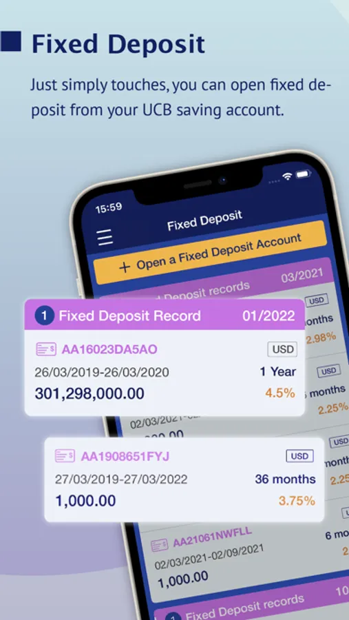 Now just simply touches, you can open fixed deposit from your UCB saving account. Enjoy the growth of your wealthy!