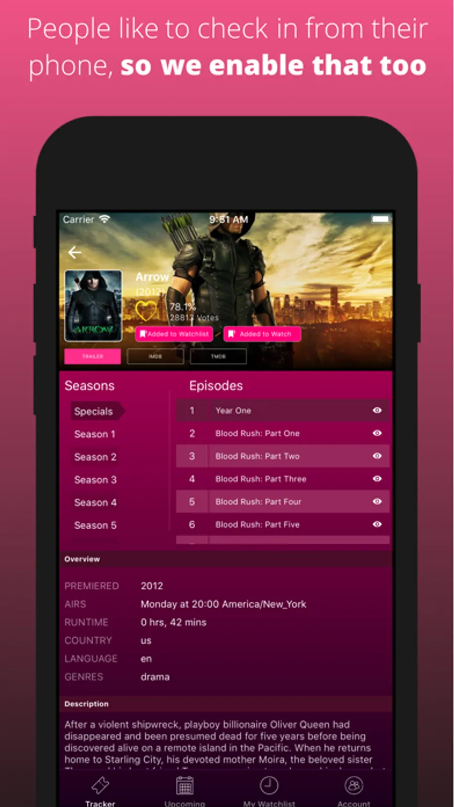Cinema Popcorn is a mobile app that does many things, but primarily keeps track of TV shows and movies you watch. Some people like to check i n from their phone, so we enable that too.