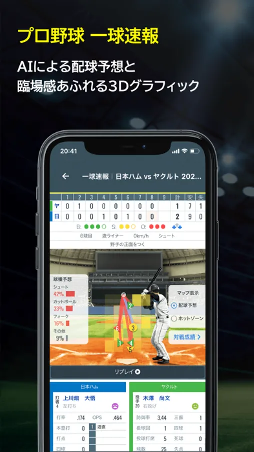 人工知能による球種・配球予想と打球方向予想の他、投手の投げた「投球の軌跡」と打者の打った「打球の軌道」を、臨場感あふれる3Dグラフィックとともにリアルタイム配信!