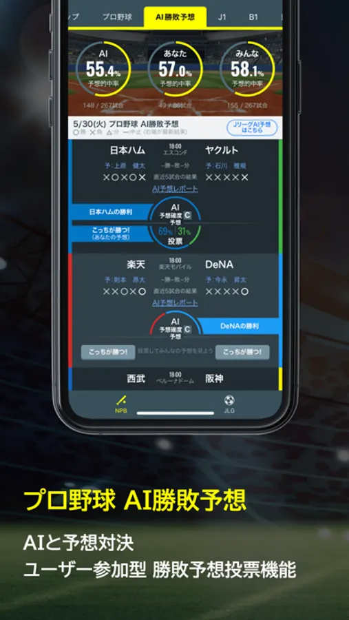 プロ野球AI勝敗予想ではどちらのチームが勝利するかを予想する投票機能で投票いただくことにより、