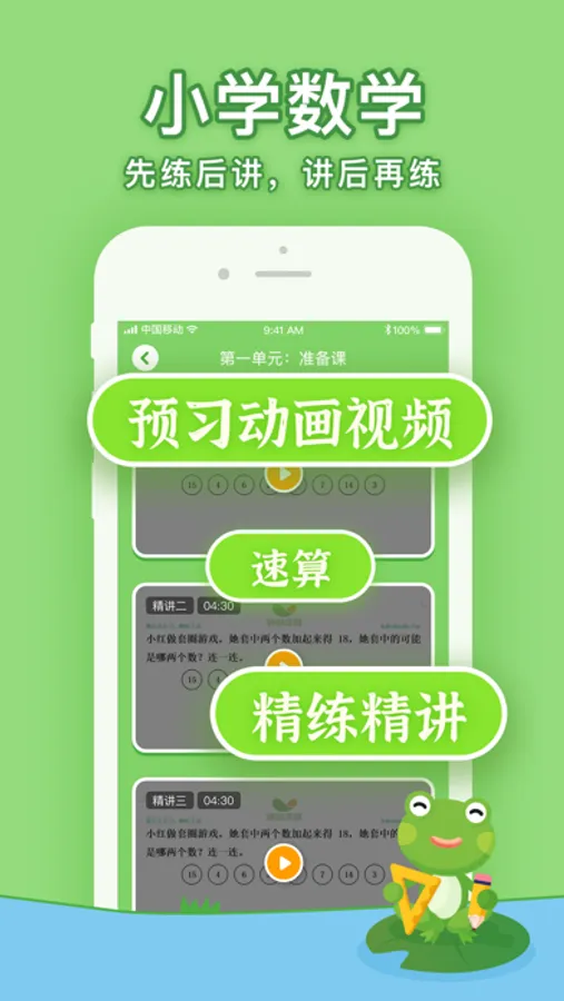 小学数学同步辅导:课文预习·复习, 每课知识讲解动画视频-用生动有趣的动画讲解每课知识点,可用于预习和复习;每单元重点题精讲视频 - 老师针对小学数学课本每个单元的难题、易错题、易考题进行精讲。看视频前小朋友可以先做题,再看视频,可反复观看,并提供同类型的检验题检查学习效果。同时提数学复习习题、口算、听算、视算等在线学习软件帮助小朋友随时利用碎片时间练习。