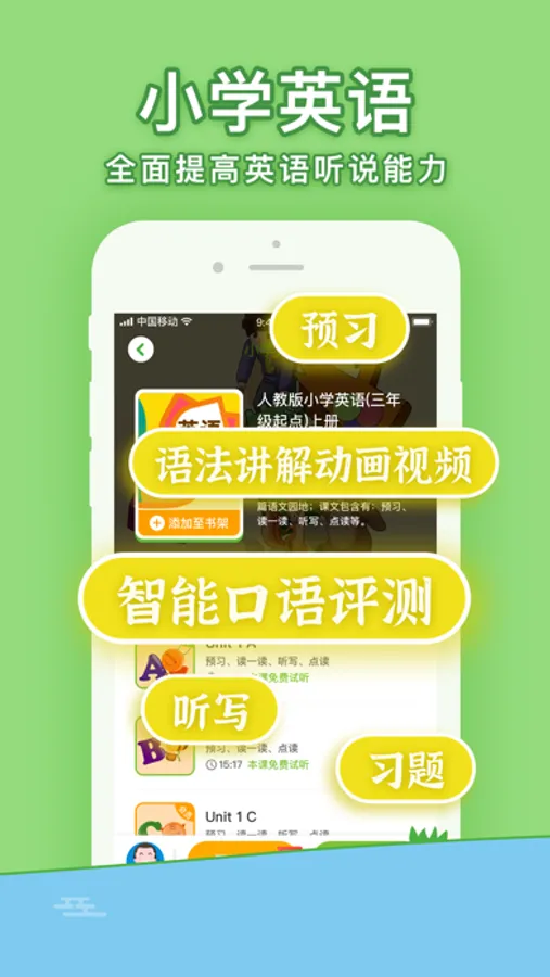小学英语同步辅导:小学英语预习课程帮助孩子预习每一篇课文;小学英语语法讲解动画视频-讲解小学英语课本的每一课的句型和语法;智能口语练习 - 利用针对每一篇课文开发的趣味人工智能朗读,小朋友能朗读单词、句子和课文,通过范读、打分和纠错等自动口语测评功能,小朋友能纠正错误的发音,全面提升孩子的英语能力。此外还有单词听写等小学英语学习工具。