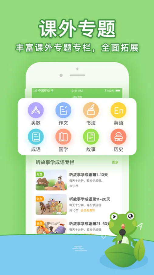 专题拓展提高:提供小学作文、国学、故事、历史、百科、小学奥数(思维训练)英语自然拼读法、小学英语知识点讲解动画课程、书法写字等专题课程,寒暑假专项突破,全面拓展。