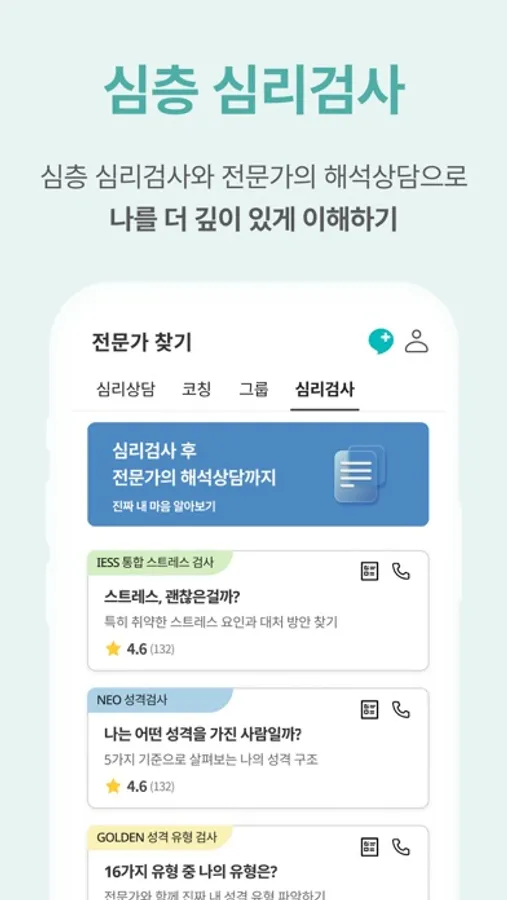 스트레스 지수, 성격유형 등 다양한 종류의 전문 심리검사를 제공합니다. 검사 후 전문가와 1:1로 이야기 나누며 결과지를 해석해 볼 수 있습니다. 나에 대해 더 깊이 이해하고 삶의 방향을 설정해보세요.