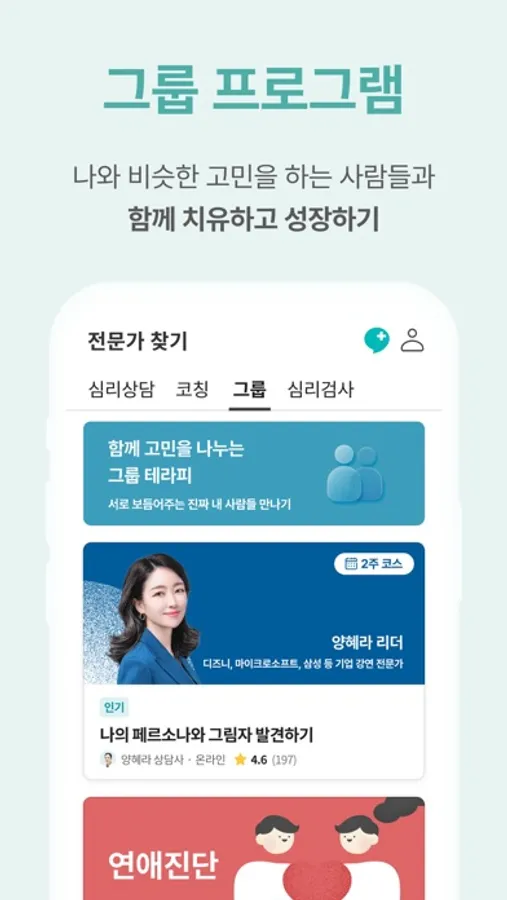원하는 시간과 공간에서 비대면으로 심리상담과 코칭을 진행해 보세요. 대면 심리상담과 코칭 대비 약 70% 저렴한 가격으로 만나보실 수 있습니다.