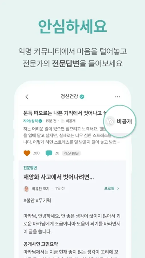 마인드카페 커뮤니티는 익명성이 보장됩니다. 어떤 고민이든 자유롭게 털어놓고 따뜻한 위로와 공감을 나눠 보세요. 커뮤니티 사연 글에서 전문가님들의 전문 답변도 만나볼 수 있습니다.