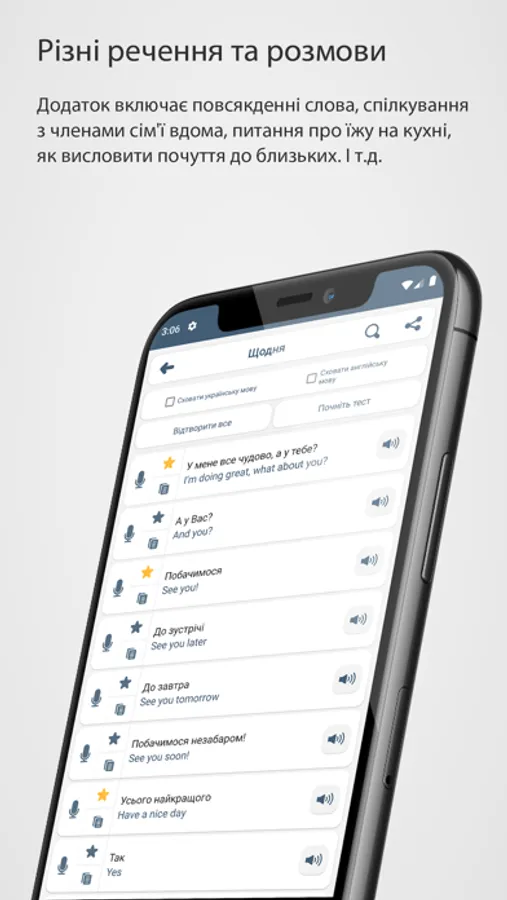 Додаток включає щоденні привітання, спілкування з членами сім’ї вдома, питання про їжу на кухні та про те, як висловити свої почуття до близьких.