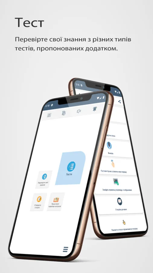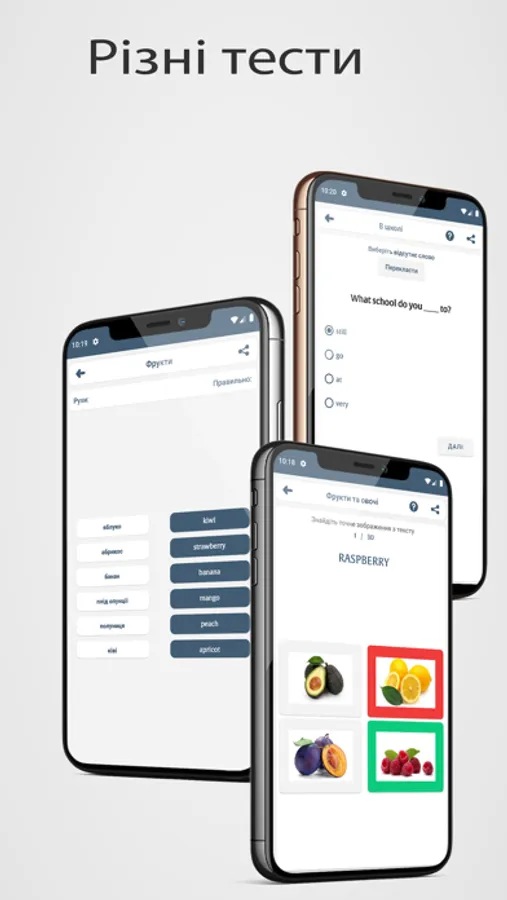 Перевірте свої знання з різних типів тестів, пропонованих додатком, таких як: поєднання слів з однаковим значенням, пошук правильної відповіді на малюнку, переклад слова або речення, прослуховування речення, а потім написання, вимовляння речення, що з’являється і інші.