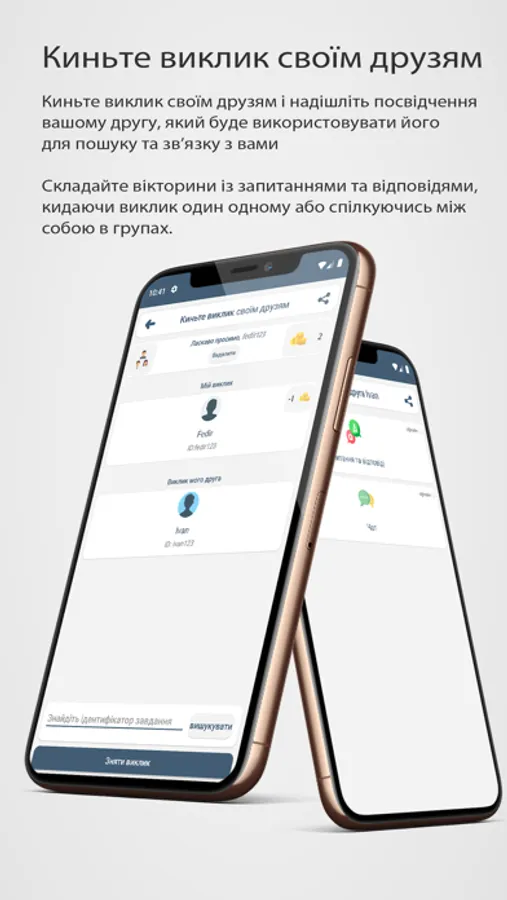 Створіть виклик і надішліть посвідчення своєму другові, який використає його, щоб знайти вас і зв’язатися з вами. Створюйте вікторини із запитаннями та відповідями в рамках викликів та кидайте виклик одне одному або спілкуйтесь між собою в групах.
