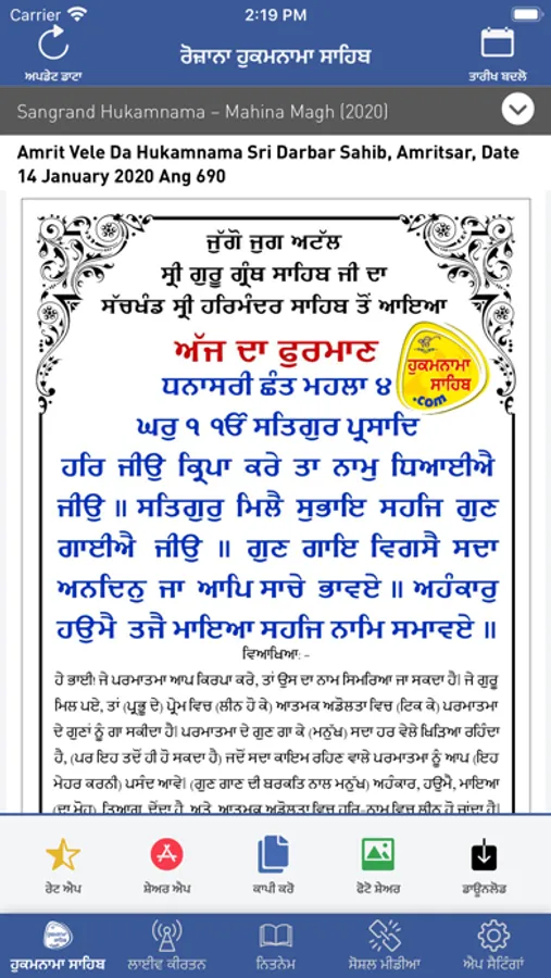 Hukamnama Sahib Application is designed and developed with aim to provide Daily Hukamnama Sahib and Live Kirtan Streaming on your mobile. Read the Daily Hukamnama from Sachkhand Sri Harimandir Sahib Amritsar in Gurmukhi, Punjabi, English and Hindi Language right within the application.