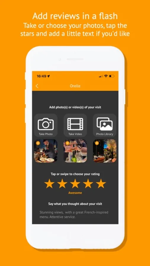 All you need to do to add a review is take or choose at least one photo or video, tap to set the rating, and add a short text review if you want to. Text reviews are optional, and limited to 140 characters, so you don't have to worry about writing an essay!