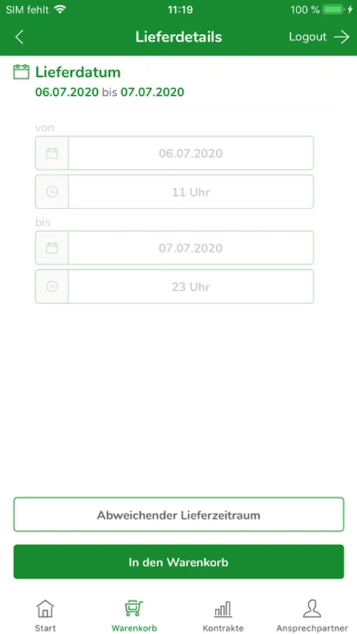 Wählen Sie aus der Kontrakte-Liste die gewünschte Vereinbarung und schauen Sie sich die Details zu Artikel, Menge und Zeitraum an.