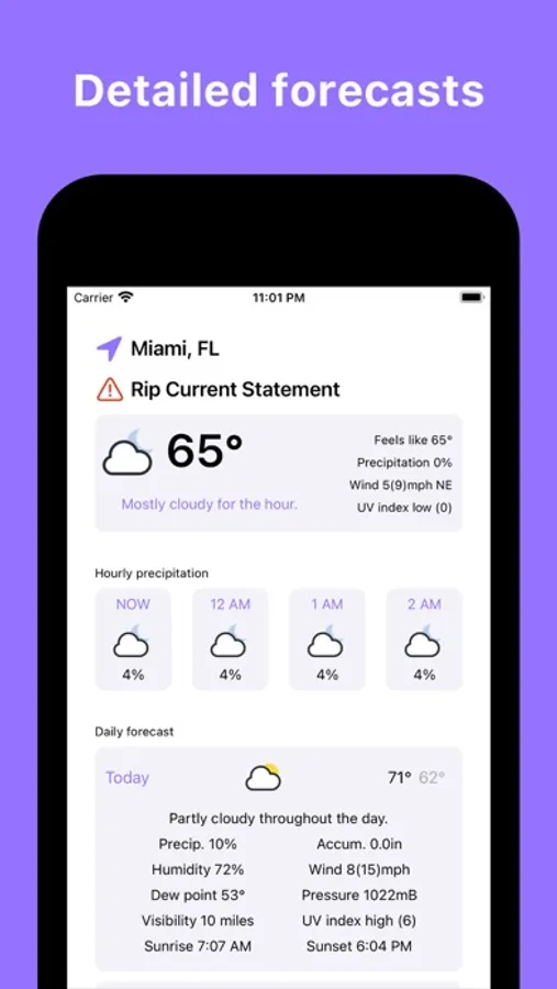 - Swipe on the hourly cards to view hourly conditions up to 24 hours in advance