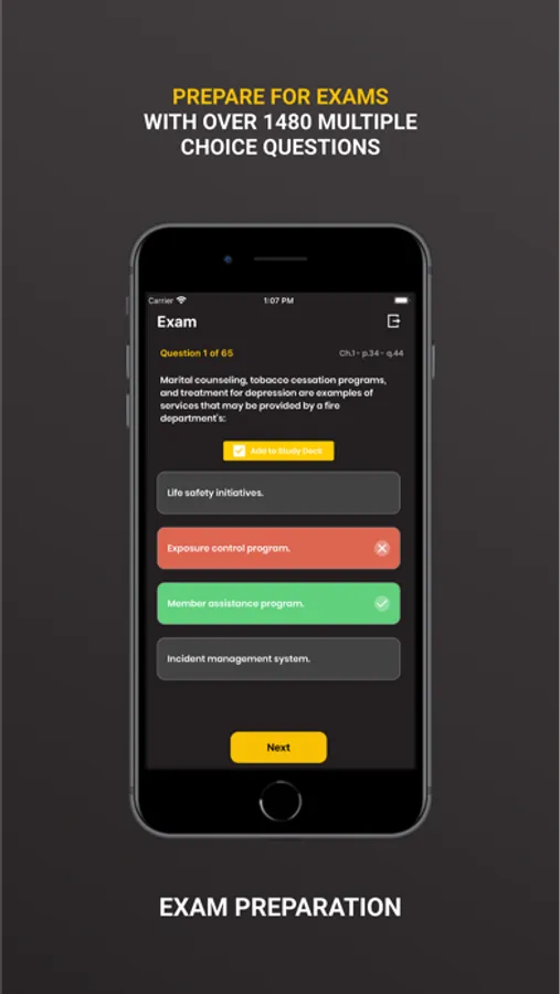 Use the 1,480 IFSTAⓇ-validated Exam Prep questions to confirm your understanding of the content in the Essentials of Fire Fighting, 7th Edition, Manual. The Exam Prep covers all 27 chapters of the Manual. Exam Prep tracks and records your progress, allowing you to review your exams and study your weaknesses. In addition, your missed questions are automatically added to your study deck. This feature requires an in-app purchase. All users have free access to Chapter 1.