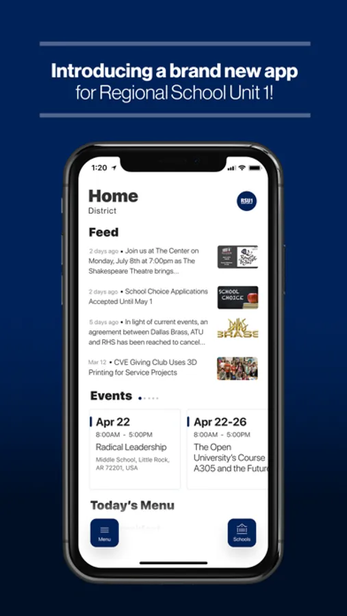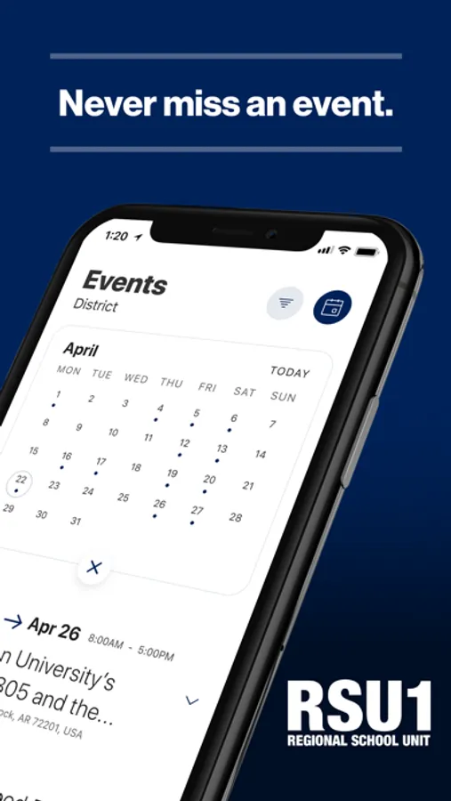 The event section shows a list of events throughout the district. Users can add an event to your calendar to share the event with friends and family with one tap.