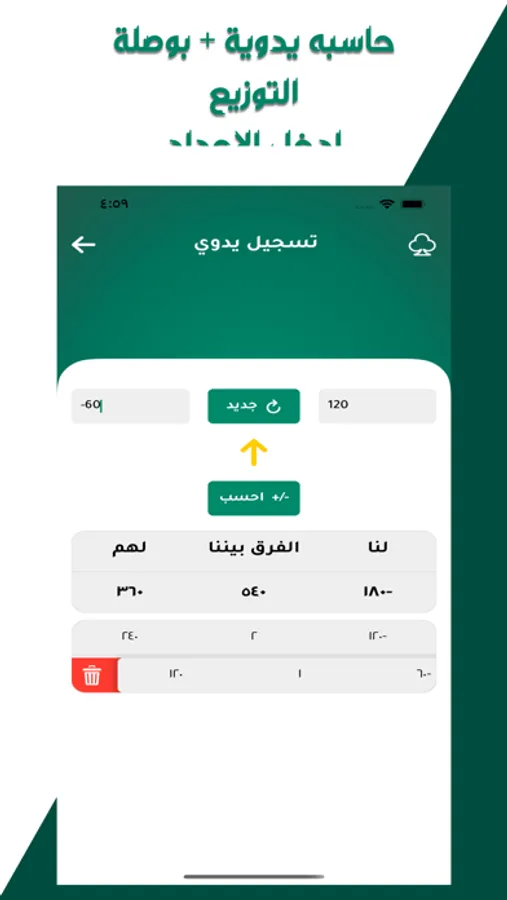 اما اذا كنت تريد التسجيل يدويا فالخيار متوفر ايضا وبه يمكنك ادخال الاعداد والضغط على احسب ويقوم هو بالجمع واظهار الفرق وعدد اللعبات وكذلك بوصلة التوزيع