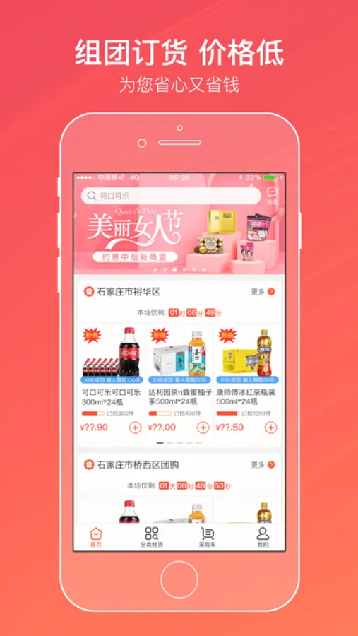 快消品团购批发平台,包含登录/注册、首页团购活动展示、分类筛选、搜索、采购车、我的优惠券、我的个人信息、我的订单、联系客服等功能