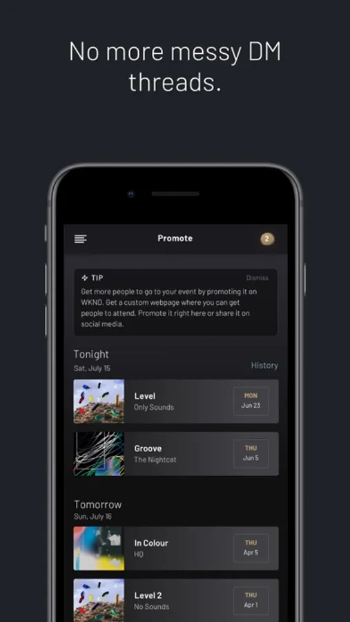 WKND simplifies the noise that interrupts the music experience. Plan, promote, collect payments, and push notifications to partygoers in one place so you can kick it now and better understand the analytics later.