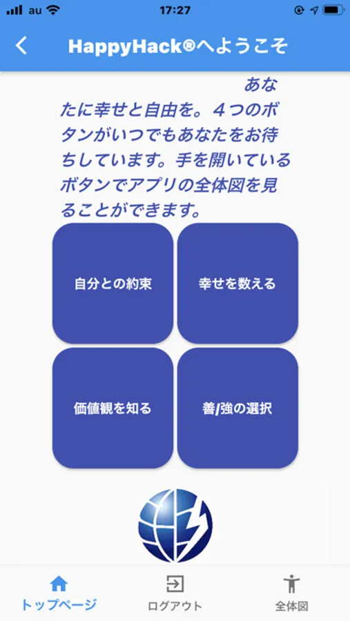 ハッピーハック(HappyHackⓇ)は、『幸せを記録する』『自分と他人の価値観を理解する』『善き人に・強き人にあなたの選択』という三本柱を持っています。