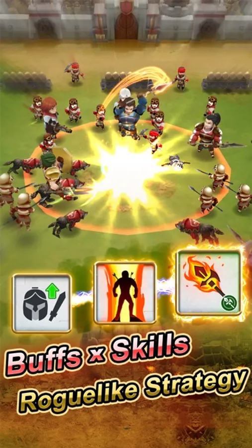 ● Enter the roguelike arena and battle through waves of spearmen cavalry and archer enemies from enemy castle, and stack up random and unique skills to help you battle through.
