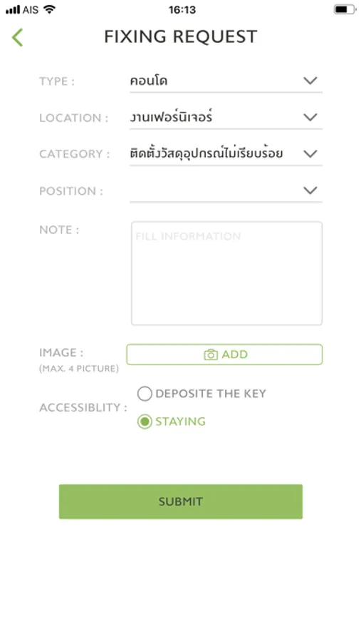 - Fixing : แจ้งซ่อมและติดตามการแจ้งซ่อม
