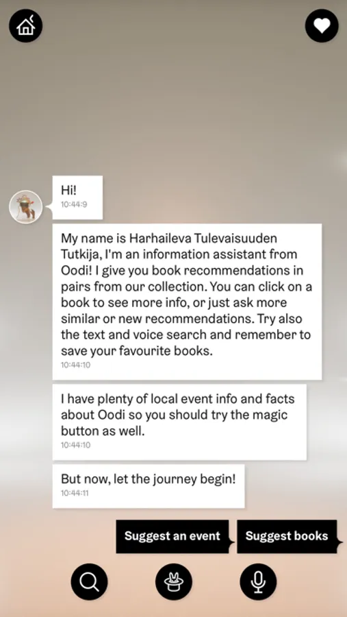 Oodi enhances your library experience with six distinctive AI-powered library assistants serving you reading suggestions. In addition to books, get real-time information about Oodi.